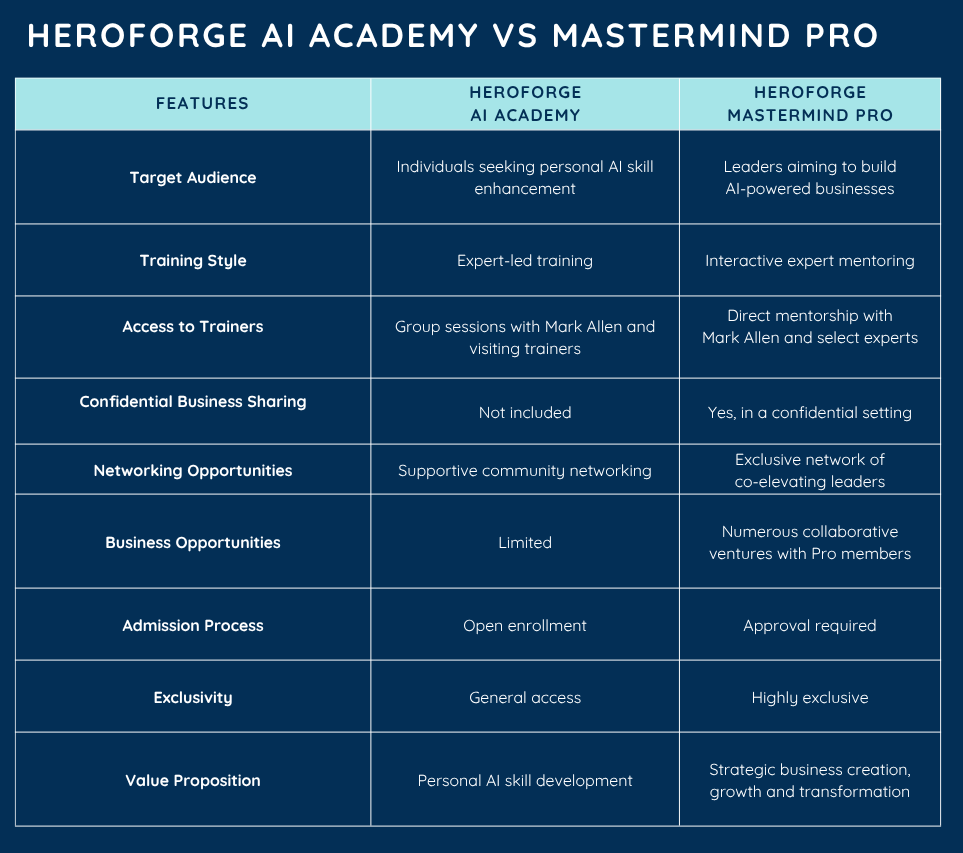 Join a highly selective, confidential community of visionary leaders who are leveraging AI not just to profit but to shape the future. HeroForge Mastermind Pro is your gateway to exclusive business opportunities, transformative strategies, and meaningful collaborations to scale your impact and create a legacy of innovation.